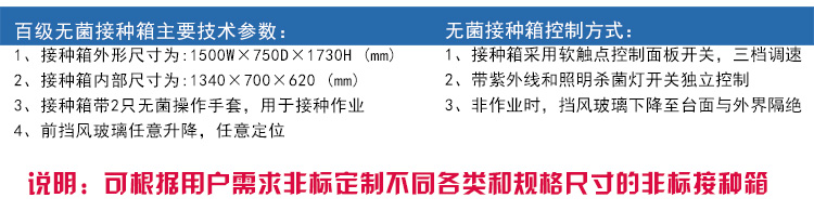 無菌接種箱為百級(jí)環(huán)境,內(nèi)部帶有紫外線殺菌燈,在將接種種苗或菌包放入接箱內(nèi)后,內(nèi)部進(jìn)行密閉殺菌,在接種過程中全程密閉,人員通過無菌手套箱進(jìn)行操作,手套箱為無菌室專用,有極強(qiáng)的耐酸耐堿性。百級(jí)無菌接箱可極大的提高接種的成活率,效率達(dá)到99%以上。