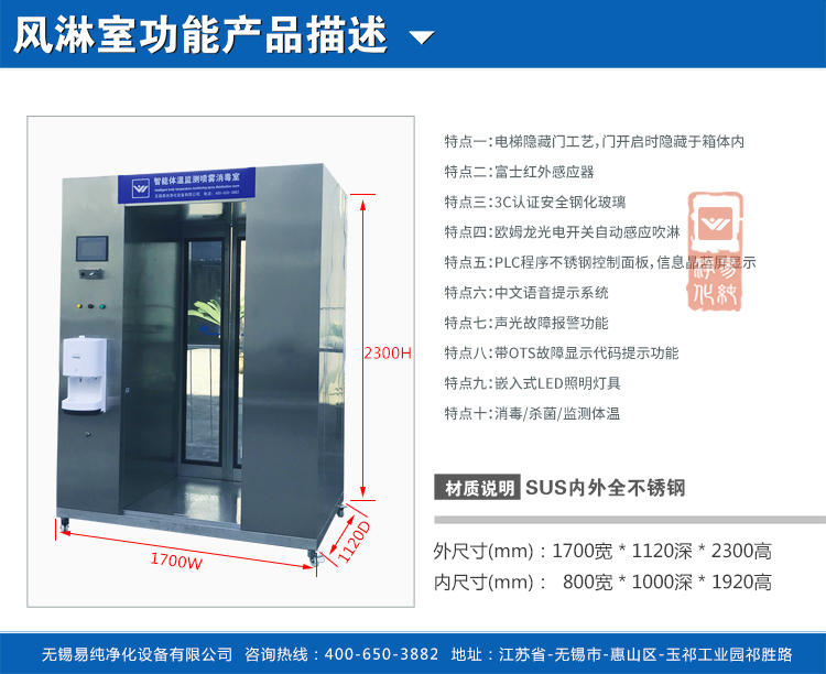 技術優勢:采用微電腦控制,智能感應消毒,無人值守模式,消毒時間可調,單向和雙向消毒,電子門禁功能和溫度監控消毒室供用戶選擇。