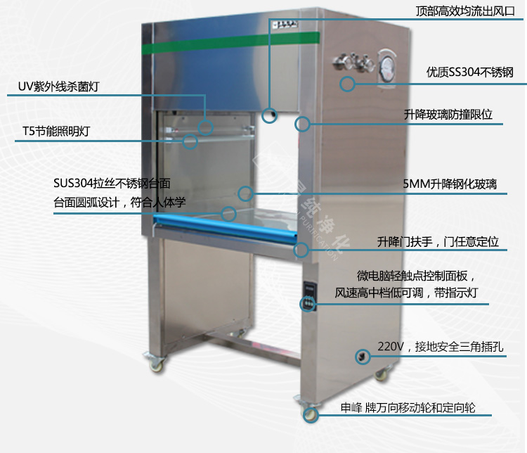 17.電器控制:控制面板上有紫外線殺菌燈,照燈,風機調速控制軟觸點開關;